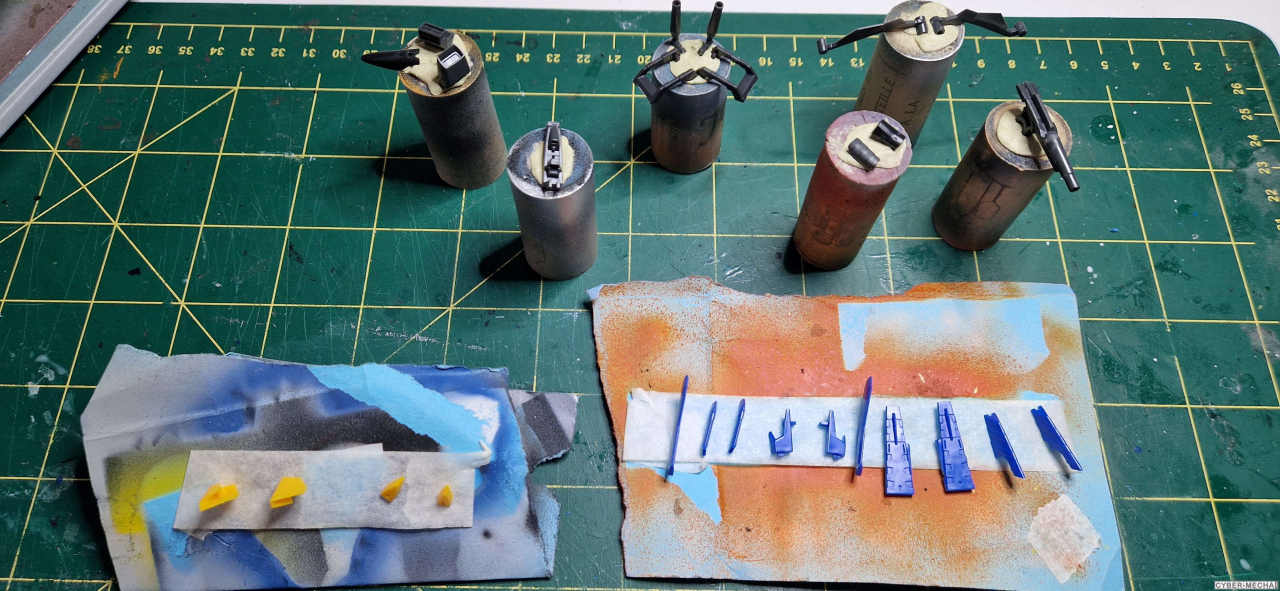 2- Sous couche grise pour les pièces blanches, grises clair, bleu et jaune et noir pour les pièces grises foncés et noir.