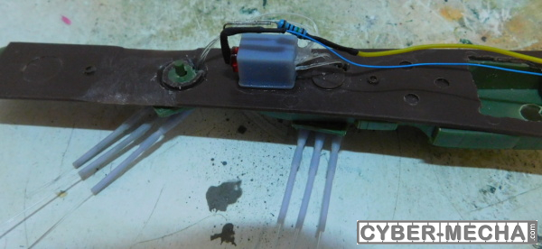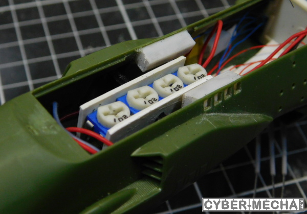 Heu, reste plus qu'à entailler le couple avant pour avancer le bloc de résistances variables; ouais, parce-que ça ne ferme plus avec le bloc LED du pont: