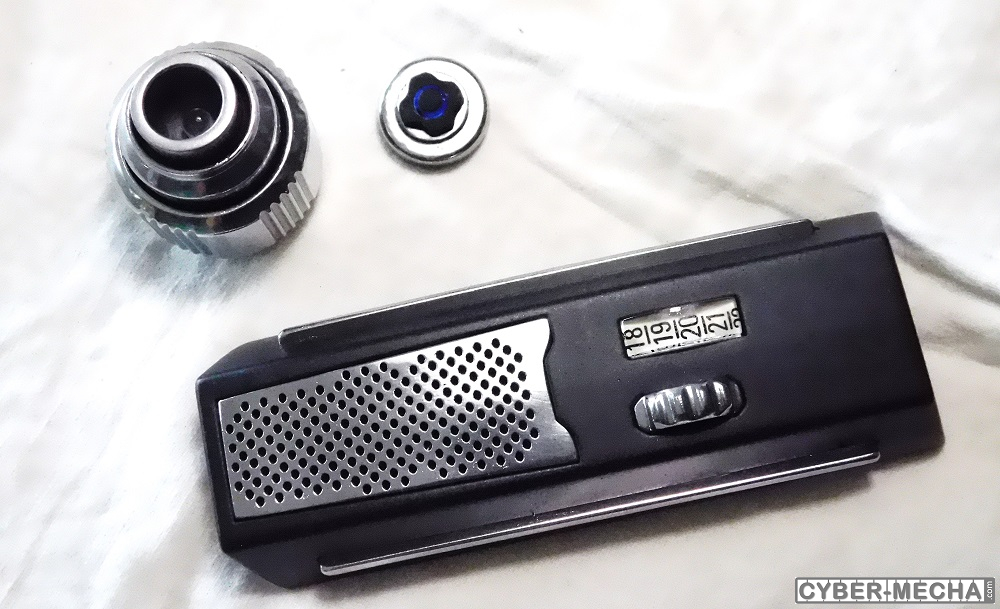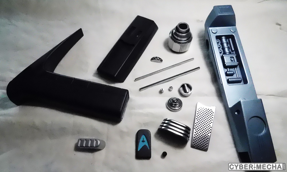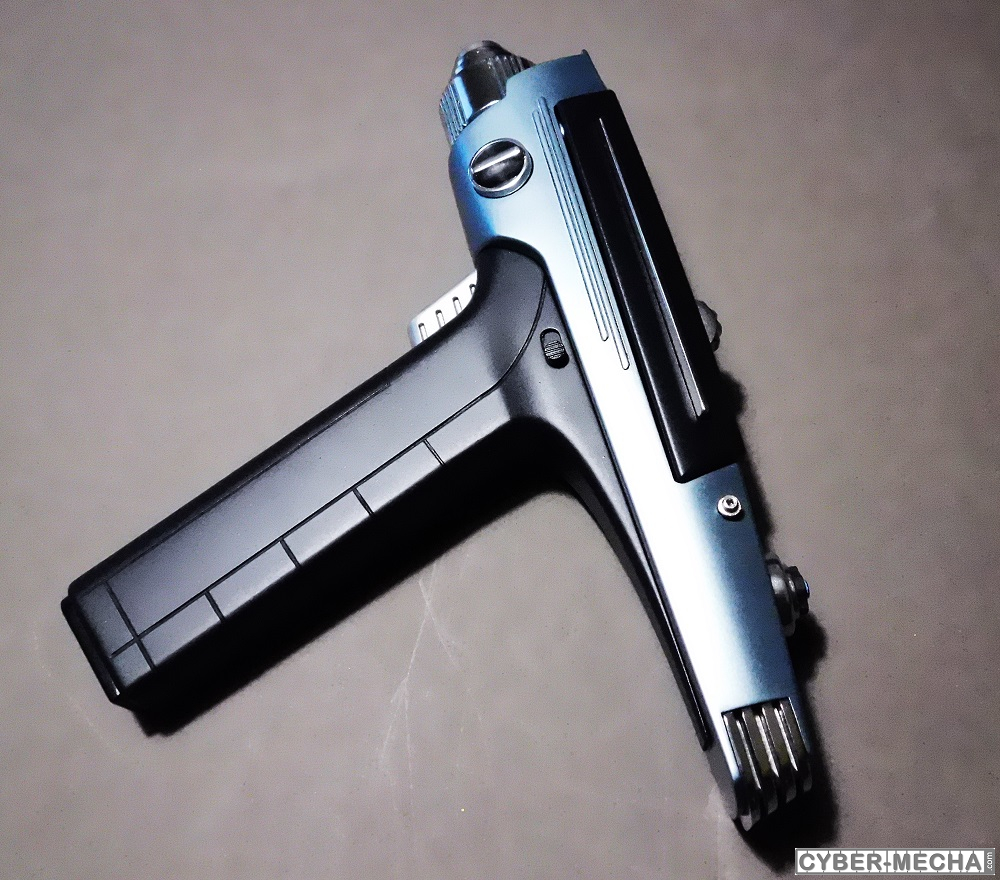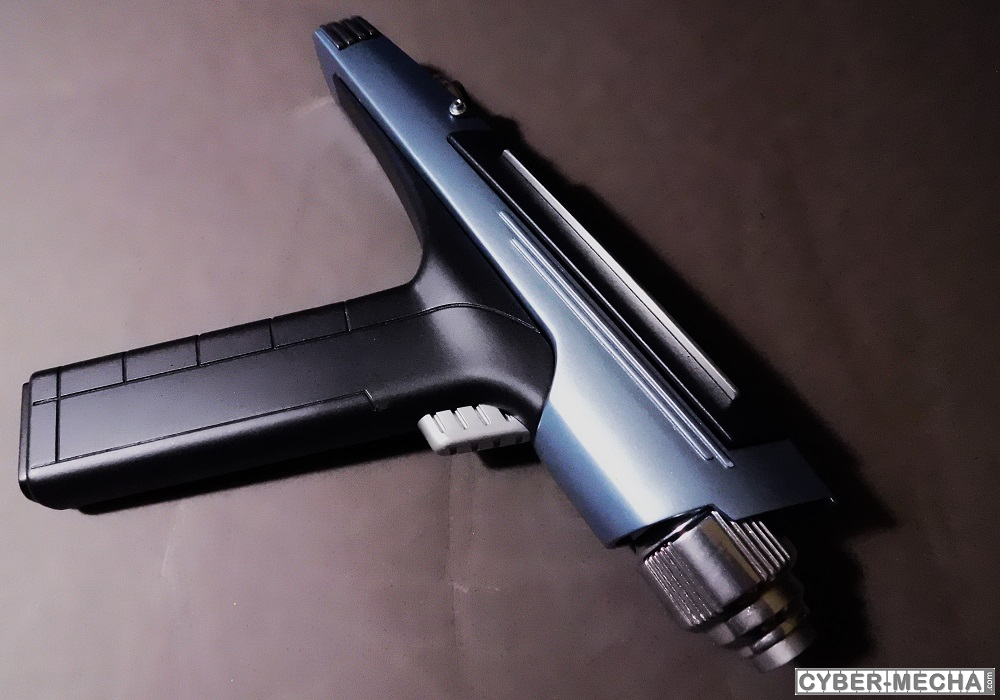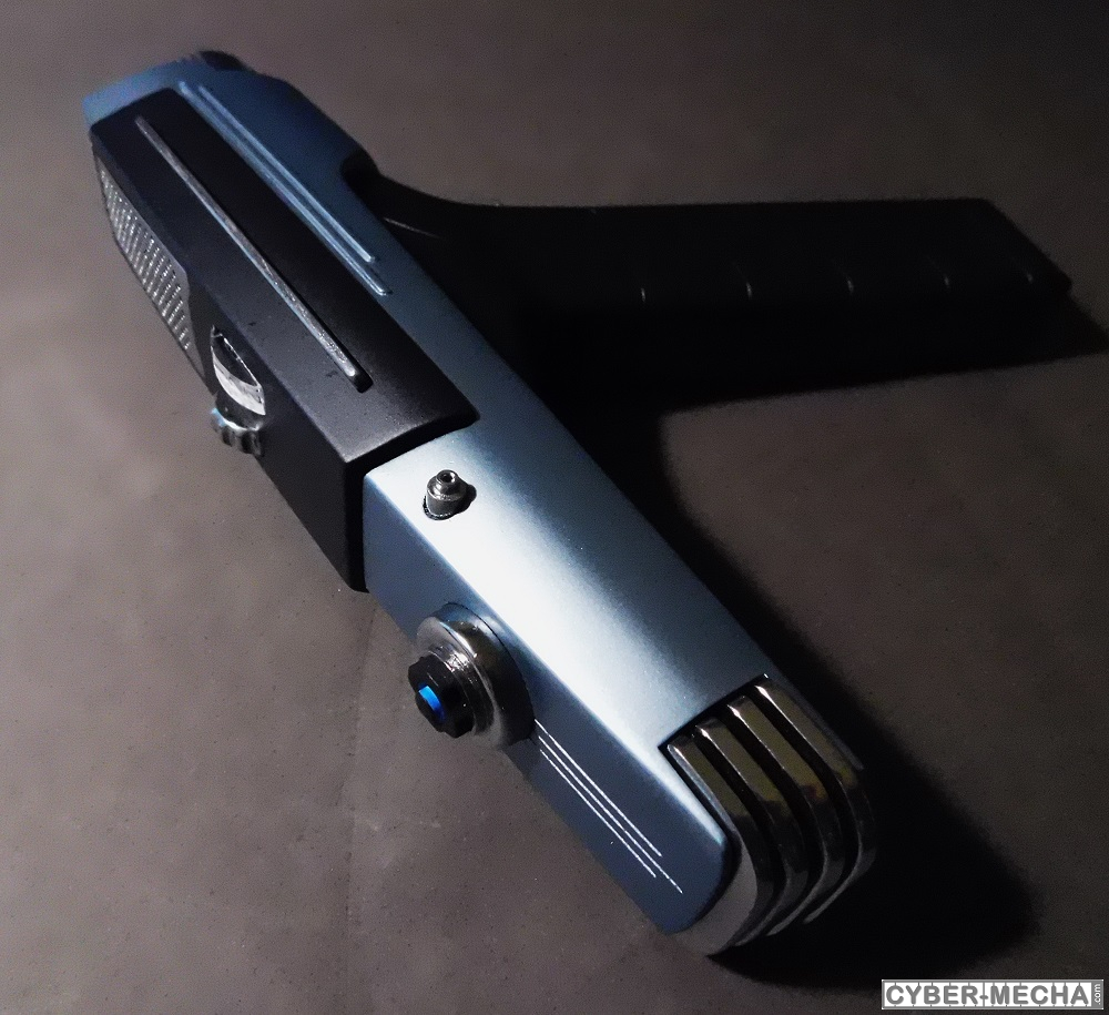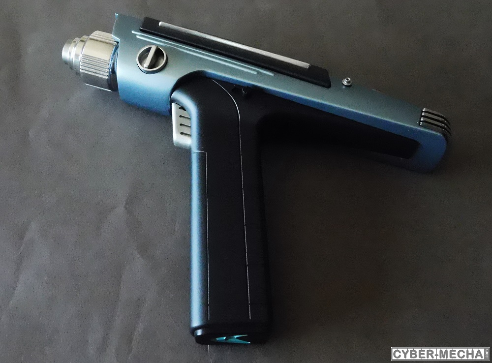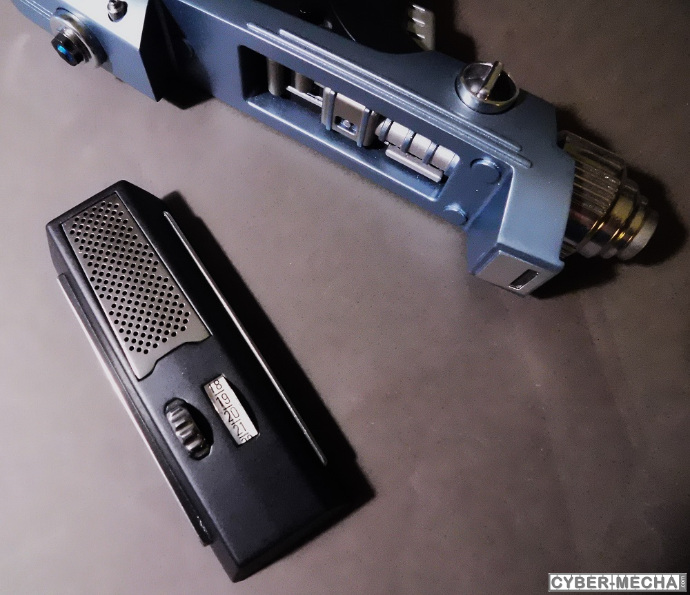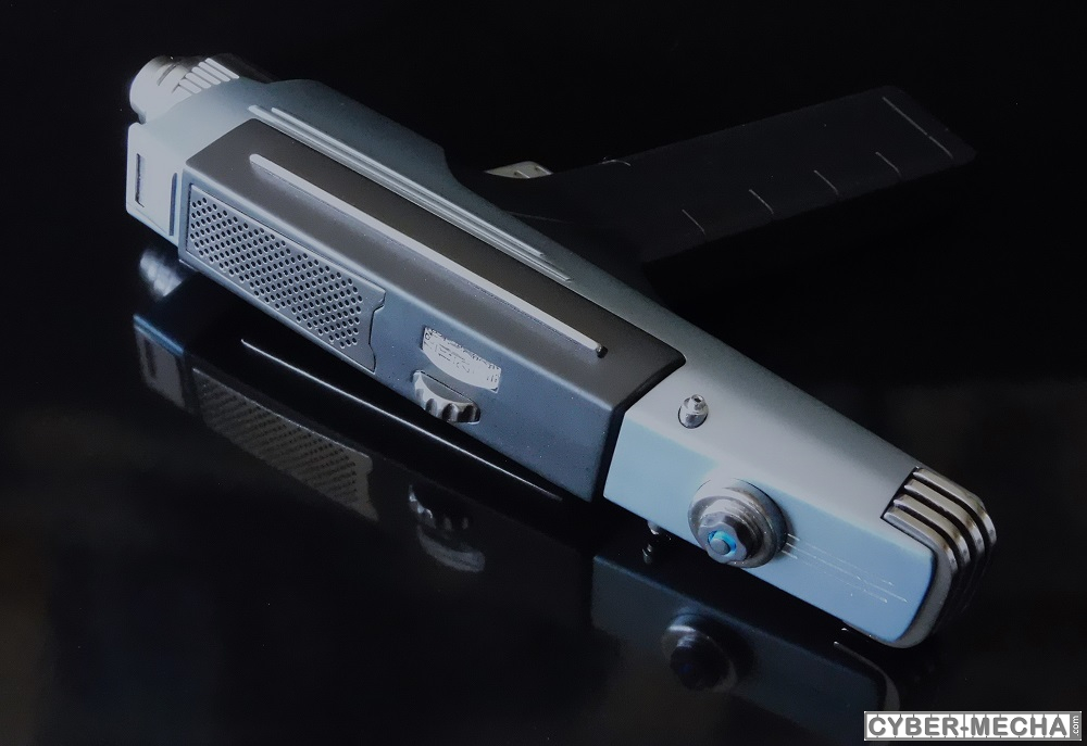 Reste quelques petits details à ajouter, l'emeteur de l'arme et la piece arrondie par dessus le compteur en resine transparente. Le marquage du compteur est fait avec des vieilles Letraset encore utilisables, le tout collé avec du Clearfix. Un peu de bleu TAMIYA transparent entre des parties noires du bouton de reglage ( lumineux normalement ). Les deux barettes laterales chromées refaites sur le mini phaser detachable, car visiblement oubliées à l'impression.