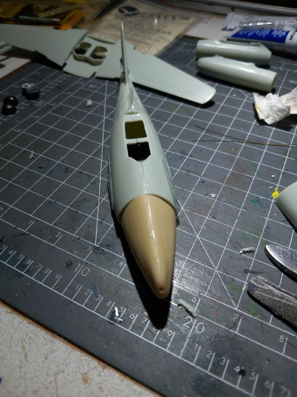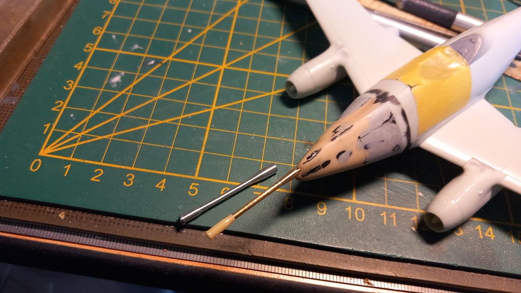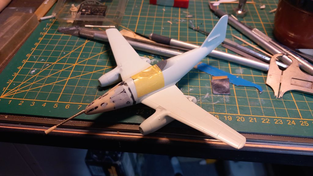 Un appareil mythique, le premier avion de chasse opérationnel à moteur à réaction de l'Histoire avec un superbe design WWII, j'attend de voir la livrée que tu vas lui faire  ;) En tout cas si tu le représentes sur son tarmac tu n'auras pas besoin de lester avec son nez en résine. :)