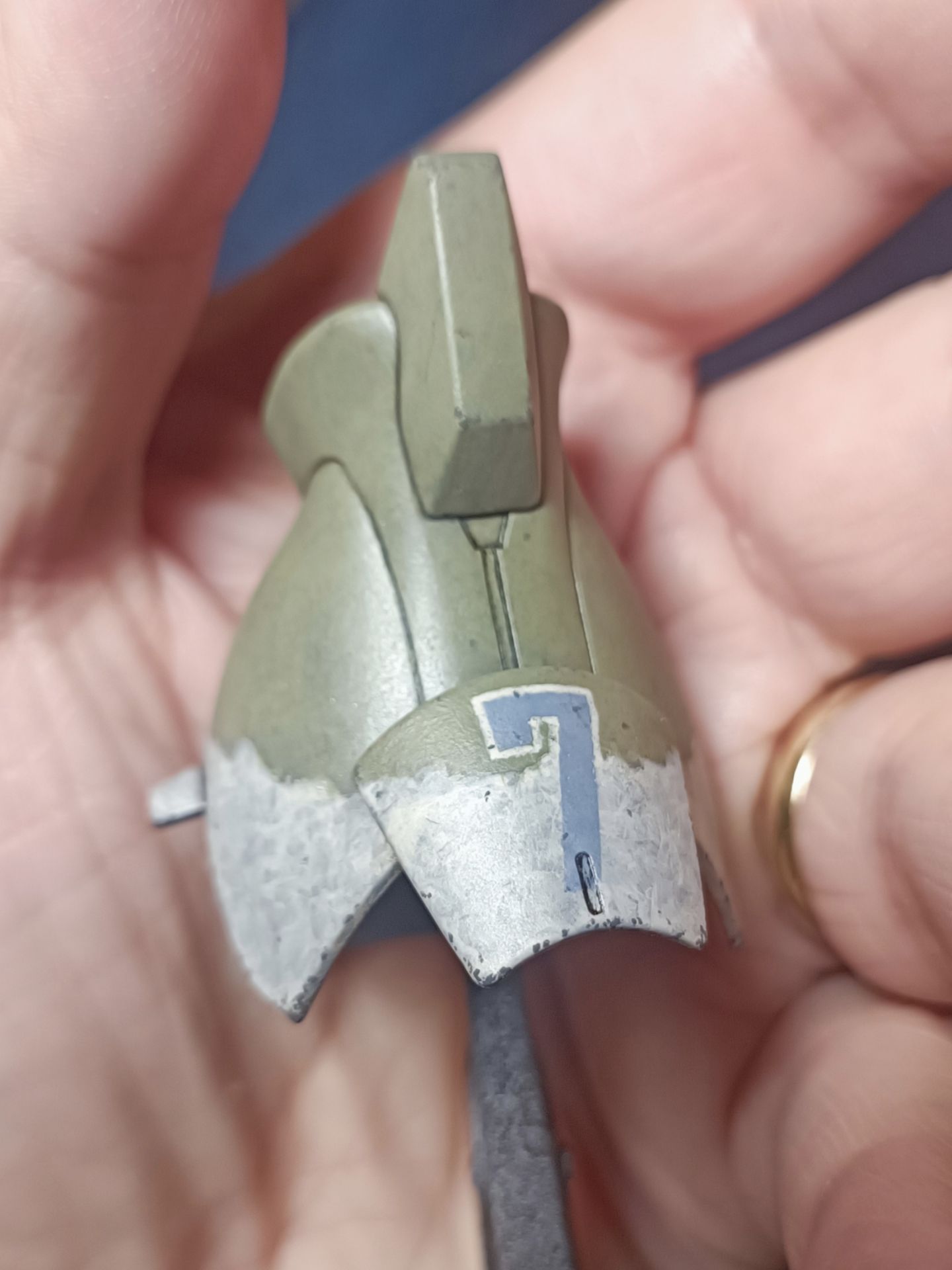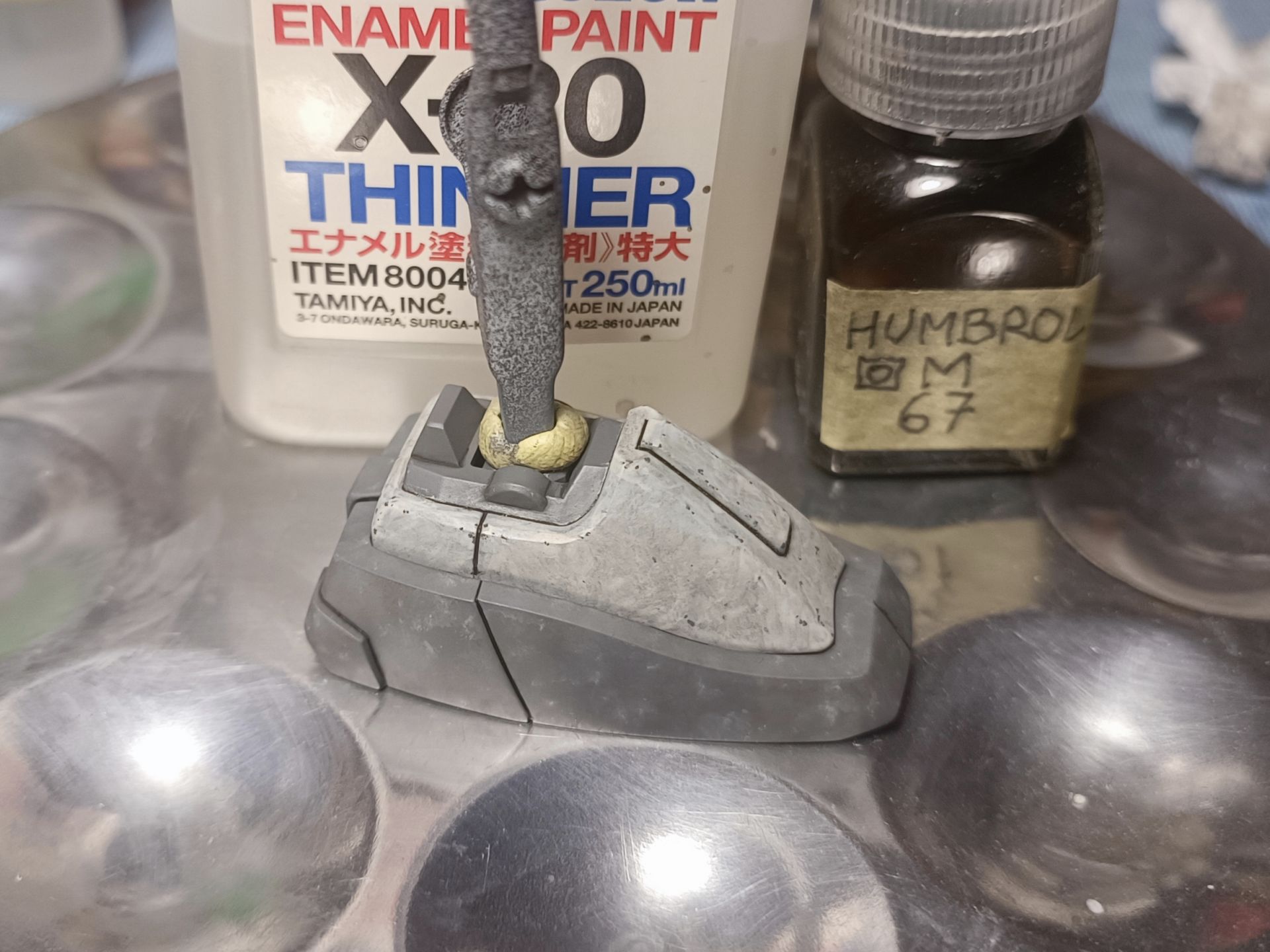 Les éclats de peintures sont faits au pinceau fin avec de l'humbrol M67 précédemment transféré dans un pot enamel de Tamiya.